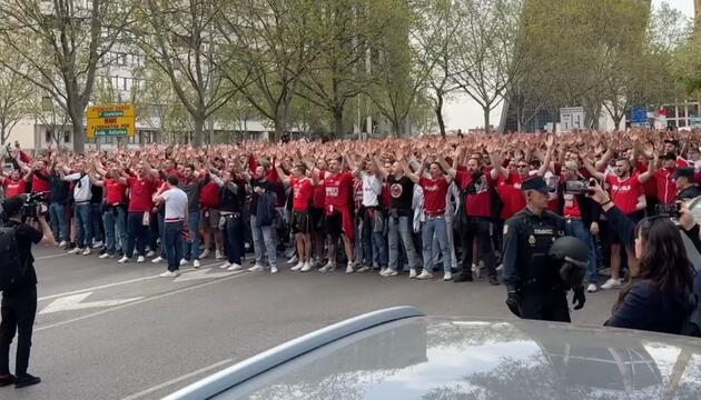 Die Münchner sind da: Mit einem Fanmarsch stimmen sich die mitgereisten Fans des FC Bayern schon vor dem Anpfiff auf das Champions-League-Topspiel gegen Real Madrid ein.