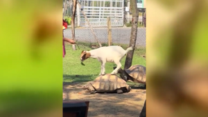 Ziege fährt auf Riesenschildkröte per Anhalter mit