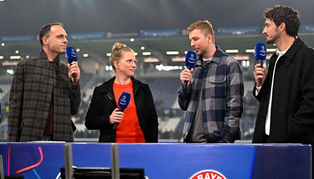 Vor dem Champions-League-Spiel der Bayern bei Atalanta Bergamo stehen die Prime-Video-Experten Christoph Kramer, Mats Hummels und Tabea Kemme am Spielfeldrand, während sich die Bayern aufwärmen. Nacheinander begrüssen die Bayern-Spieler die Experten-Runde - mit einer Ausnahme.