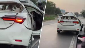 Mann steuert schwer beschädigtes Auto durch den Verkehr