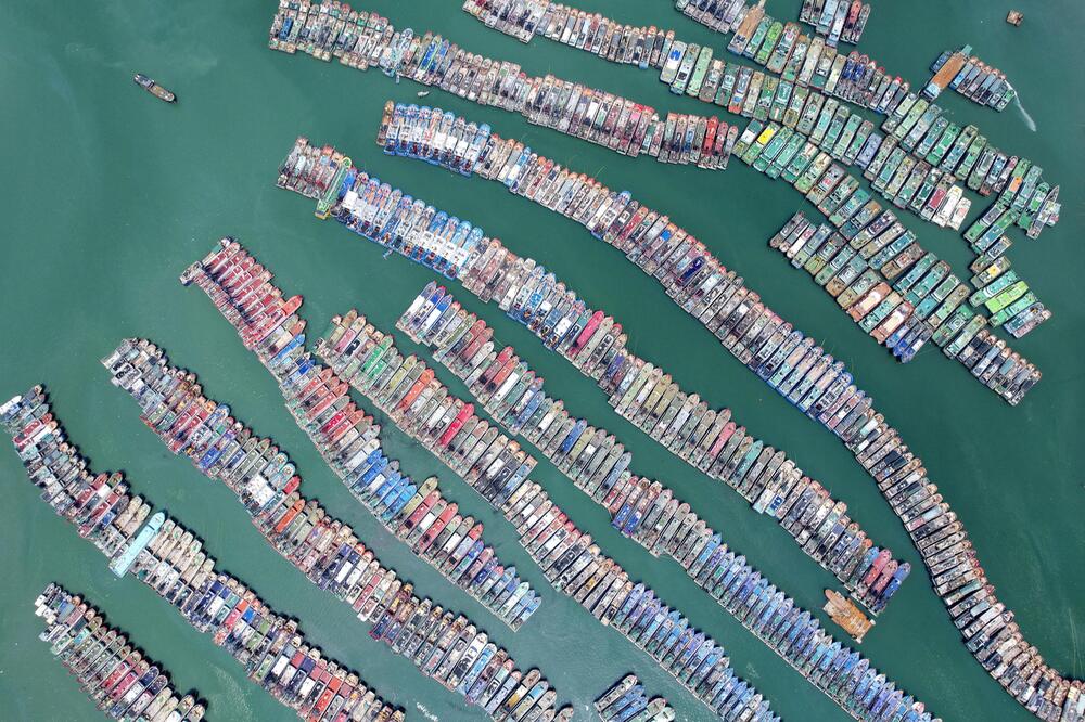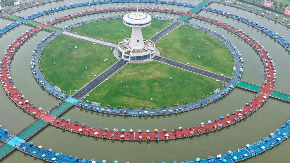 Angler nehmen trotz Regens an einem Angelwettbewerb am International Round Pond in Suqian in der Provinz Jiangsu teil.