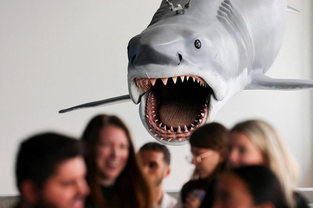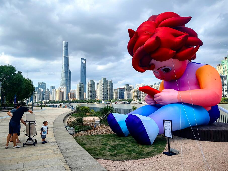 Zwei Frauen gehen an einer aufblasbaren Haifigur vorbei, die in einem Kunstviertel in Peking ausgestellt ist.