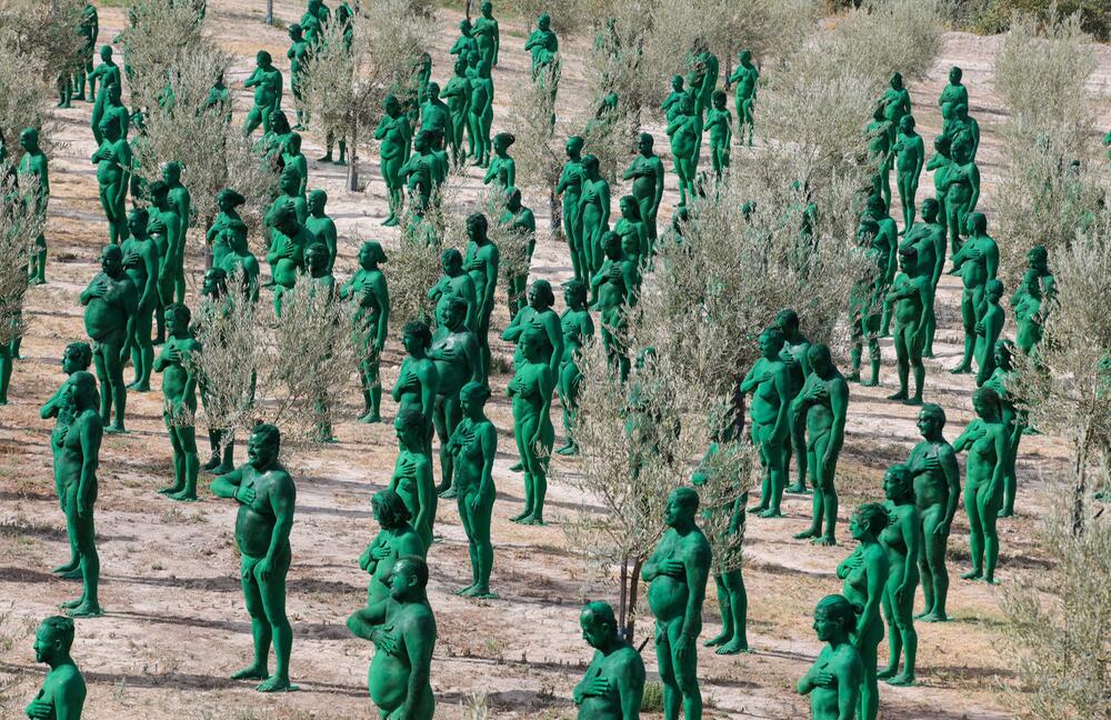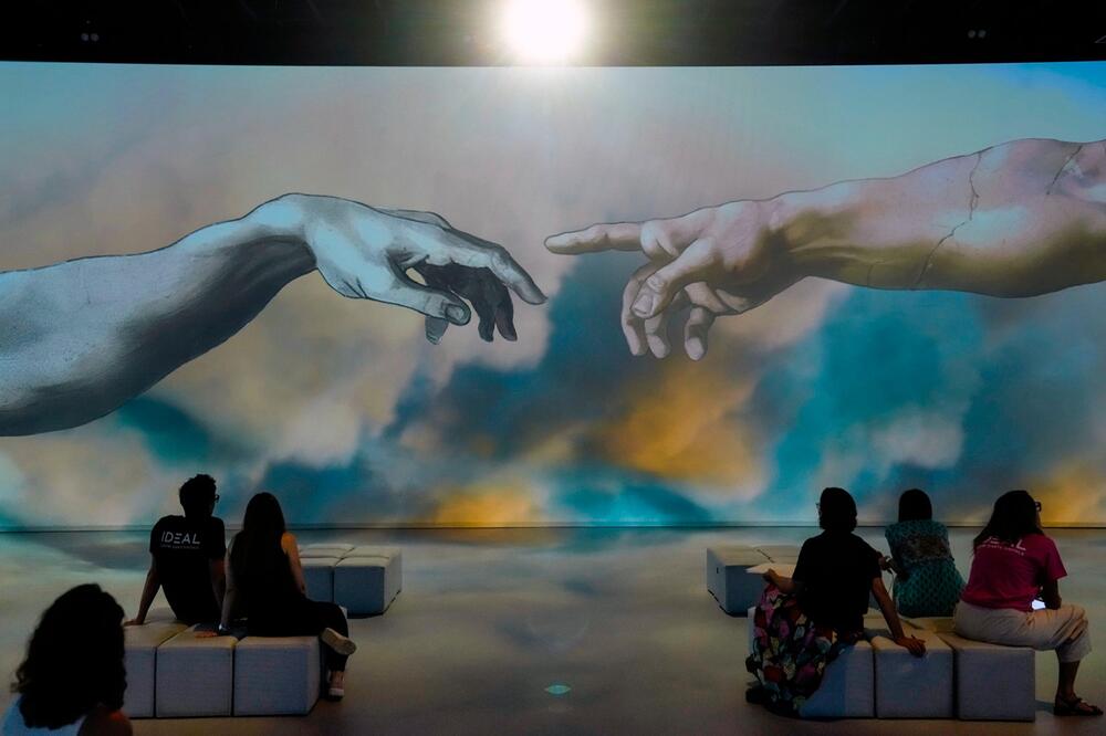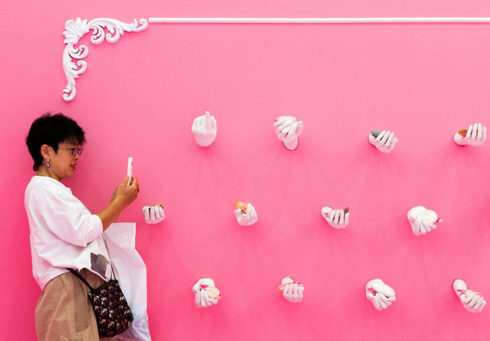 Eine Frau macht im JD Global Soap Museum im 798 Art District in Peking ein Foto von Skulpturen, die Hände darstellen und Seifenstücke halten.