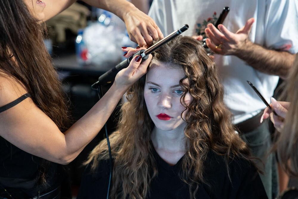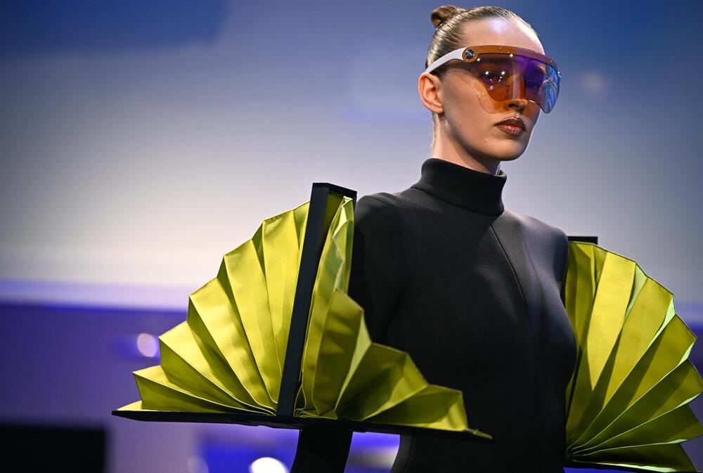 Bei Sonnenuntergang auf der Floating Bridge im Moskauer Zaryadye-Park zeigt ein Model eine Kreation der russischen Designerin Julia Dalakian – im Rahmen der Moscow Fashion Week.