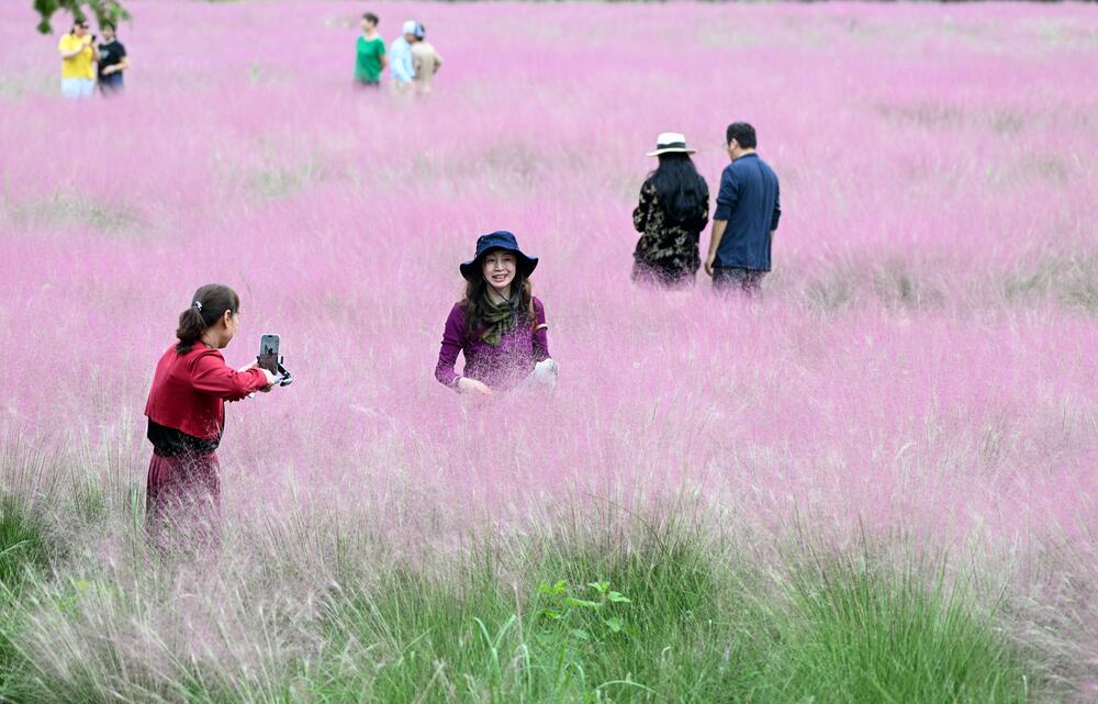 Touristen geniessen die Herbstlandschaft zwischen dem rosa blühenden Haargras (Muhlenbergia capillaris) im Sanqiao Three Bridges Wetland Park.
