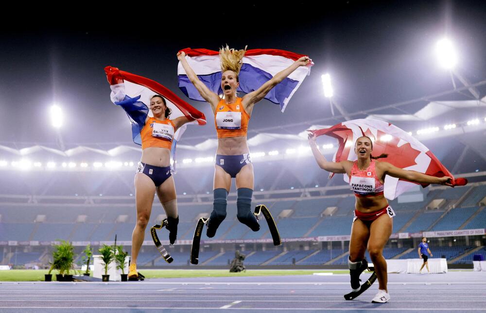 Bei den World Para Athletics Championships 2025 im Jawaharlal-Nehru-Stadion in Neu-Delhi feiert die Niederländerin Fleur Jong ihren Sieg über 100 Meter in der Klasse T64. Gemeinsam mit ihrer Landsfrau Marlene van Gansewinkel, die Silber gewann, und der Kanadierin Marissa Papaconstantinou, die Bronze holte, jubelt sie über den gemeinsamen Erfolg.
