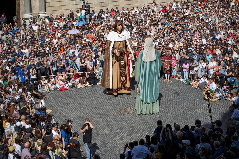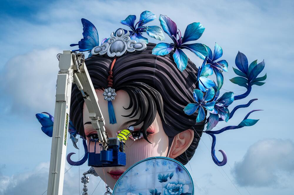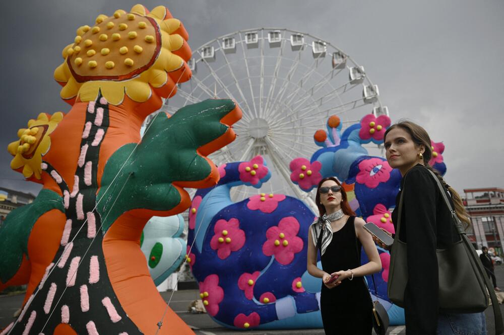 Besucher am Kontraktova-Platz in Kiew stehen neben einer Installation aufblasbarer Skulpturen des New Yorker Künstlerduos Chiaozza (Adam Frezza und Terri Chiaode), die von den Werken der ukrainischen Künstlerin Maria Prymachenko inspiriert sind.