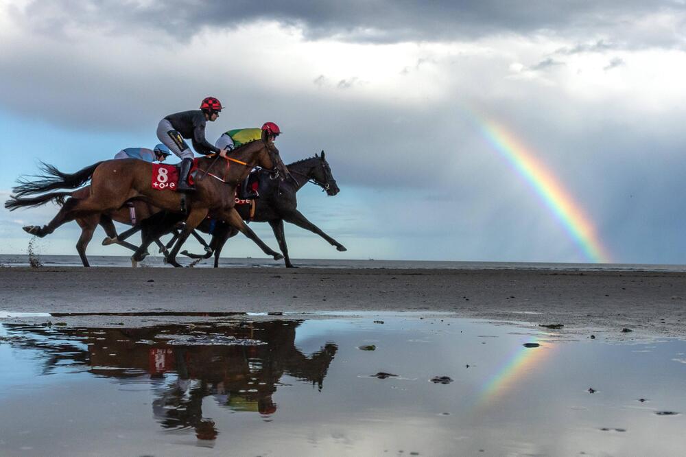 Auf dem Laytown Beach im County Meath treten Reiterinnen und Reiter beim Q-Handicap der Laytown Beach Races auf dem Sand an – ein einzigartiges Pferderennen, das direkt am Meer ausgetragen wird und Teil des offiziellen Rennprogramms ist.