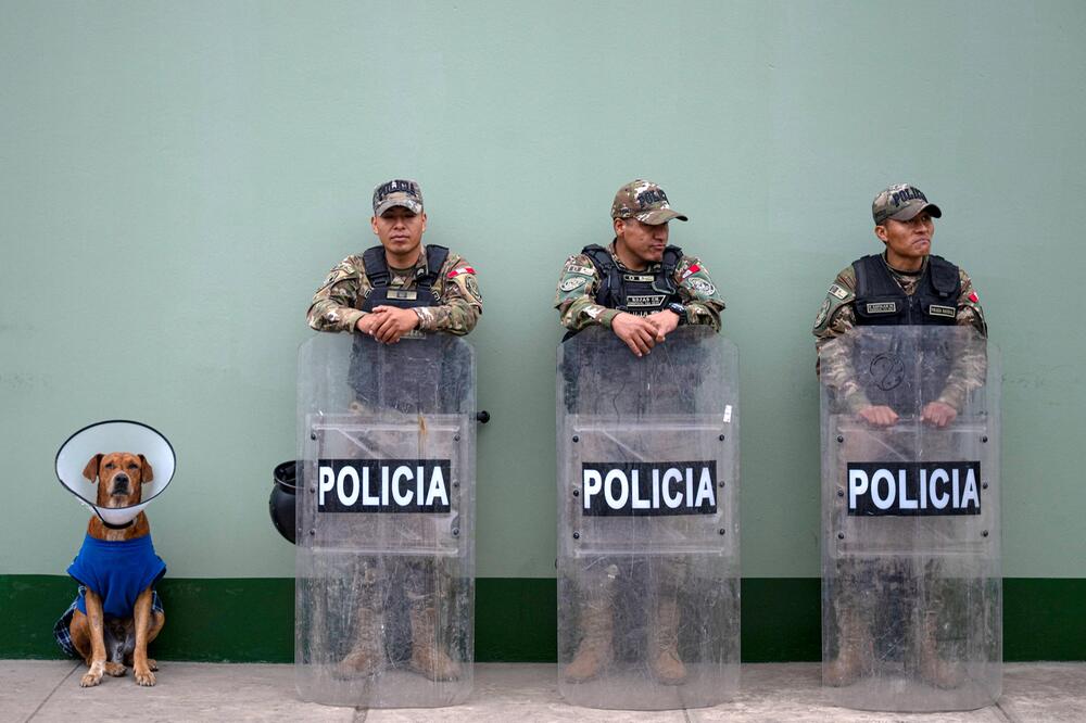 Peruanische Polizisten und ein Hund mit E-Halsband stehen vor dem Barbadillo-Gefängnis in Lima Wache. Ein Berufungsgericht in Peru hatte die Freilassung des ehemaligen Präsidenten Martín Vizcarra angeordnet, der sich zuvor wegen Korruptionsvorwürfen in Untersuchungshaft befand und letzten Monat als fluchtgefährdet eingestuft worden war.