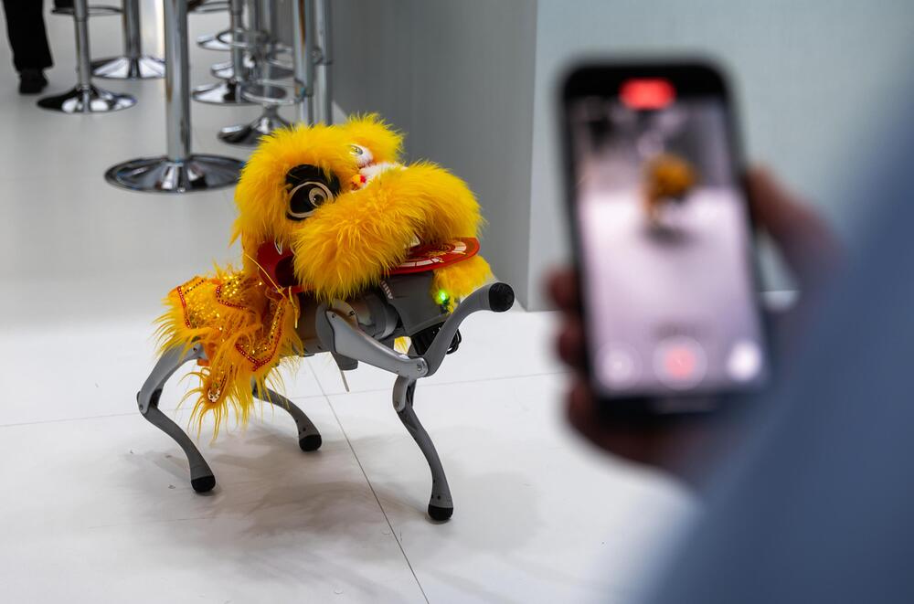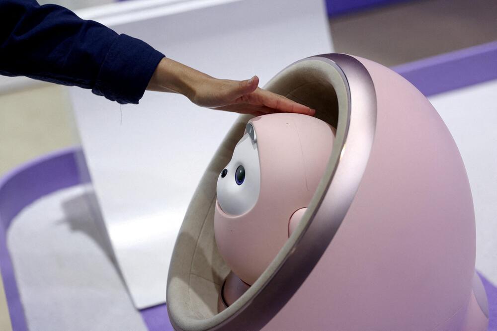 Am ersten Tag der Innovation For All (IFA), der Technologie- und Industrie-Messe in Berlin, berührt eine Person einen Ai-Me-Begleitroboter am Stand von TCL.