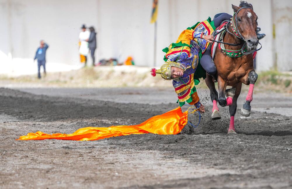 Ein Reiter zeigt bei der Eröffnungszeremonie des traditionellen Pferderennfestivals in Nagqu eine Darbietung. Das dreitägige Festival auf dem nördlichen Tibet-Plateau bietet Sportwettkämpfe, künstlerische Aufführungen sowie kulturelle Tourismusaktivitäten, die zahlreiche Einheimische und Besucher anziehen.