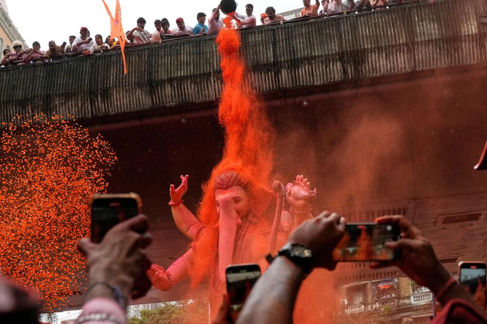 Am letzten Tag des zehntägigen Ganesh-Chaturthi-Festivals in Mumbai wird eine Statue des elefantenköpfigen Gottes Ganesha feierlich mit rotem Pulver bestreut.