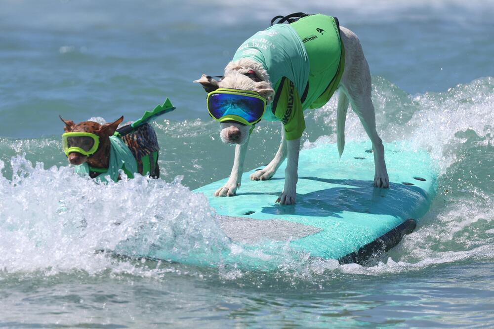 Die surffreudigen Hunde Rusty (vorn) und Faith (hinten) reiten beim "Helen Woodward Animal Center Surf Dog Surf-A-Thon" am Del Mar Dog Beach in Kalifornien gemeinsam eine Welle.