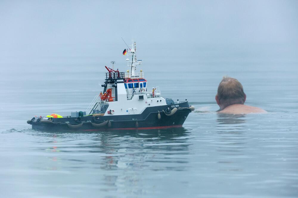 Ein Schwimmer und ein Modellboot in Form eines Schleppers sind im Nebel im Schwarzachtalsee unterwegs.