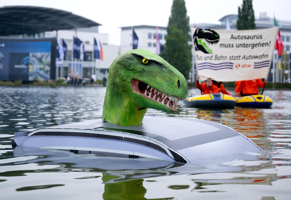 Mitglieder von Attac demonstrieren vor der Eröffnung der Internationalen Automobil-Ausstellung (IAA Mobility) mit einem "Autosaurus" im Messesee für eine Mobilitätswende.