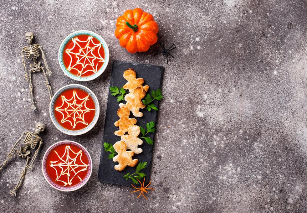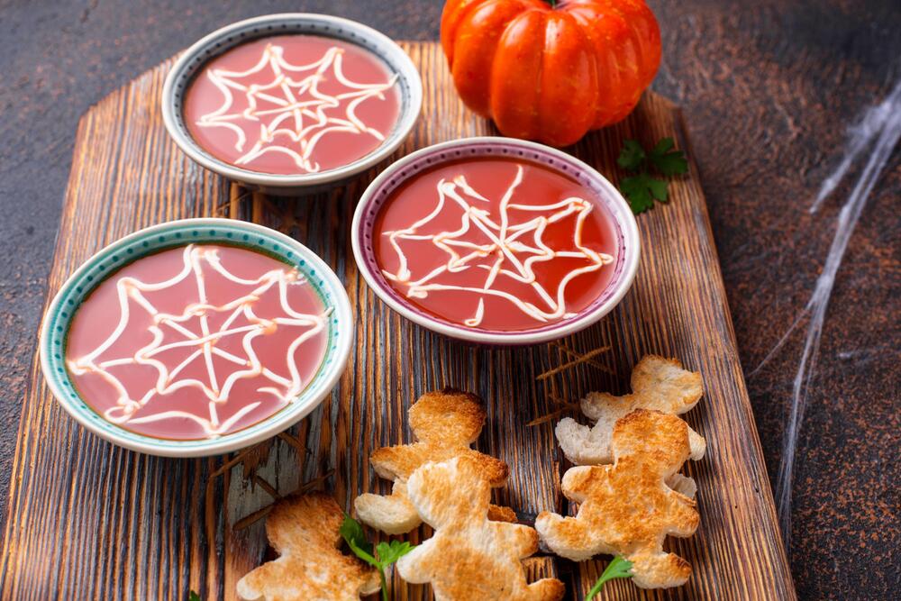 Auch Suppen lassen sich an Halloween mit schauriger Deko weiter aufpeppen. Dafür füllen Sie Crème fraîche in einen Spritzbeutel und ziehen einige Kreise auf dem Dip oder der Suppe. Danach nehmen Sie ein spitzes Messer und ziehen von der Mitte nach aussen imaginäre Fäden, um ein Spinnennetz-Muster zu kreieren. Zu Halloween passt natürlich eine Kürbissuppe, aber auch eine Blutsuppe aus Tomaten.