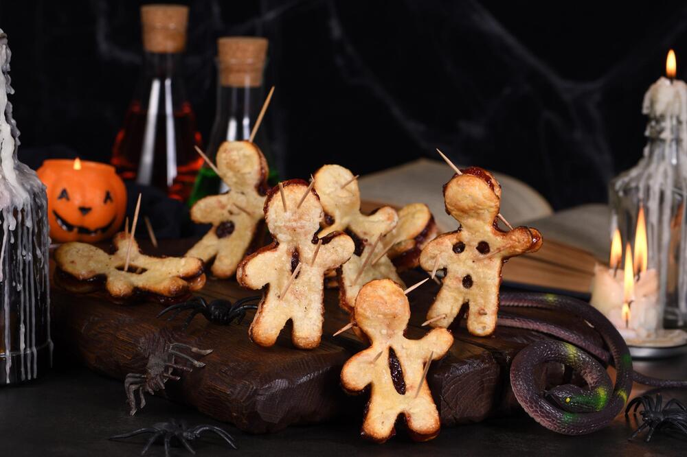 Spooky Voodoo-Püppchen aus Blätter- oder Pizzateig funktionieren auf jedem Halloween-Buffet, sind schnell zubereitet und lassen sich herzhaft mit Tomatenmark und Mozzarella oder süss mit Marmelade füllen. Wählen Sie am besten fertigen Teig aus dem Supermarkt-Kühlregal, rollen Sie den Teig aus und stechen Sie mit einer Keks-Form Männchen aus. Toll sehen auch Spinnen aus, die auch als Keks-Form erhältlich sind.