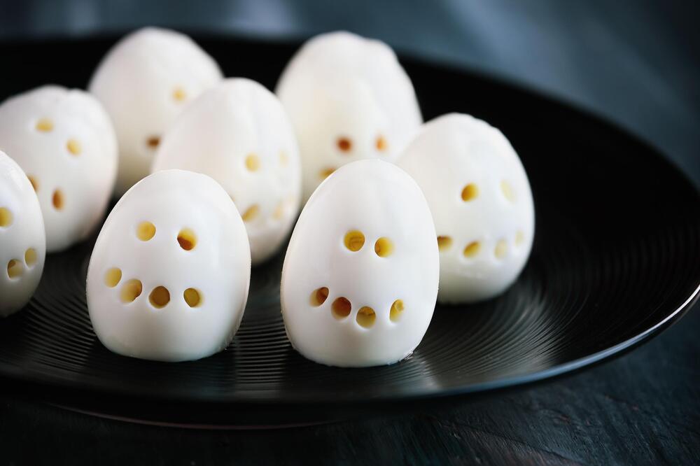 Wie wäre es mit hartgekochten Skelettschädel-Eiern? Kochen Sie die Eier etwa acht Minuten, schälen Sie sie und erschaffen Sie mit Hilfe eines Strohhalms oder Stäbchens gruselige Gesichter. Alternativ können Sie die Eier mit Lebensmittelfarbe färben: Die Schale leicht anklopfen, sodass Risse entstehen, die nach dem Färben wie Adern wirken. Legen Sie die Eier dafür etwa eine Stunde in ein Wasserbad mit kräftiger Lebensmittelfarbe.