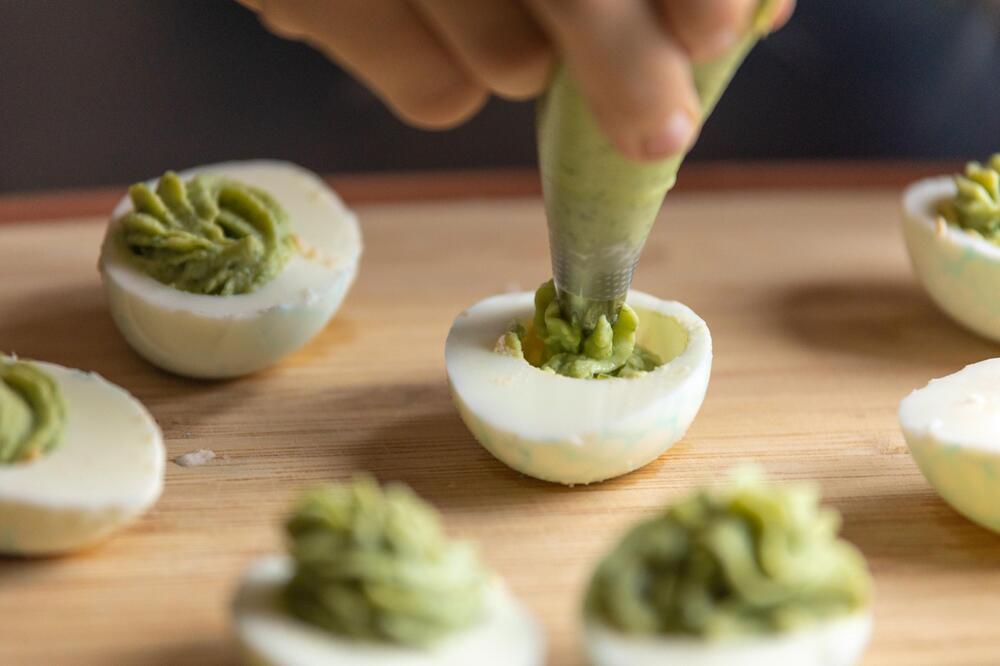 Für Teufelseier zwölf Eier etwa sieben Minuten in heissem Wasser kochen, anschliessend kalt abschrecken und vorsichtig schälen. Die Eier halbieren und das Eigelb herauslösen. Für die Füllung 100 Gramm TK-Erbsen, vier Esslöffel Mayonnaise und einen Teelöffel Senf zum Eigelb geben und pürieren. Die Masse mit einem Spritzbeutel in die Eierhälften füllen. Wer es schärfer mag, kann ein paar Spritzer Tabasco hinzufügen.