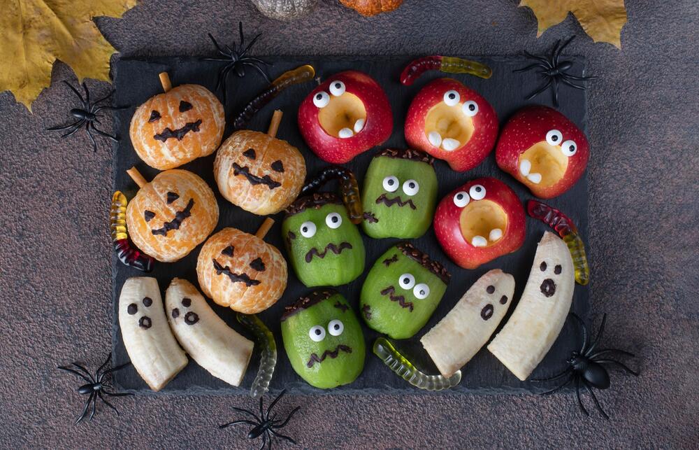 Geschälte Mandarinen lassen sich mit einem Stück Sellerie oder einer kleinen Salzstange als Strunk zu kleinen Kürbissen dekorieren. Augen und Münder können Sie einfach mit geschmolzener Schokolade malen. Alternativ werden Bananen zu niedlichen Bettlaken-Geistern: Dazu die Früchte in geschmolzene Schokolade tauchen und mit Schokodrops oder Kokosraspeln gruselig verzieren.