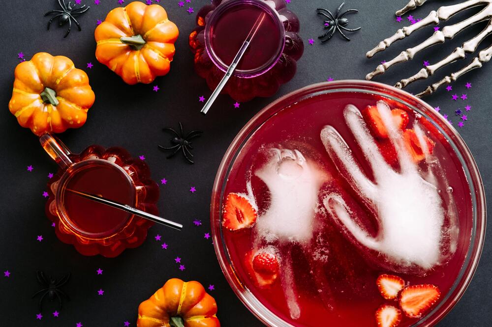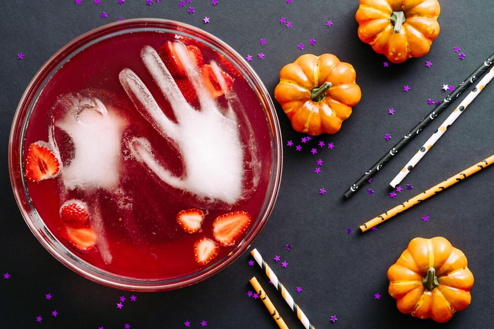 Eine schaurige Halloween-Bowle mit Eishand darf auf keiner Party fehlen. Dafür benötigen Sie einen puderfreien Latex-Handschuh, den Sie mit Wasser oder Saft füllen, fest mit einem Gummi verschliessen und für mindestens einen Tag ins Gefrierfach legen. Danach können Sie die Eishand zu der Bowle geben.