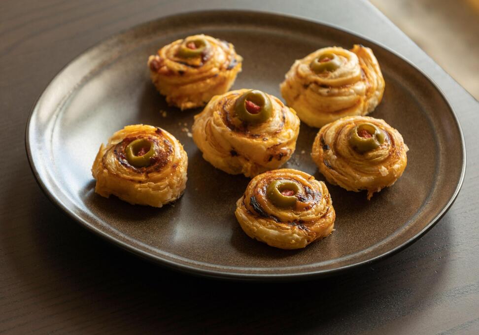 Schneiden Sie Ihre Wurst-Alternative (Zucchini, Käse, Tofu, entkernte Jalapeños, wahlweise mit Frischkäse gefüllt) sowie Blätterteig in Streifen. Sie können auch Oliven ummanteln und anstatt Mumien damit gruselige Augäpfel kreieren. Danach ummanteln Sie das Gemüse vorsichtig, platzieren die Augen in Form von Pfefferkörnern auf den Teig und backen die Mumien bei 200 Grad für zehn Minuten, bis sie goldbraun sind.