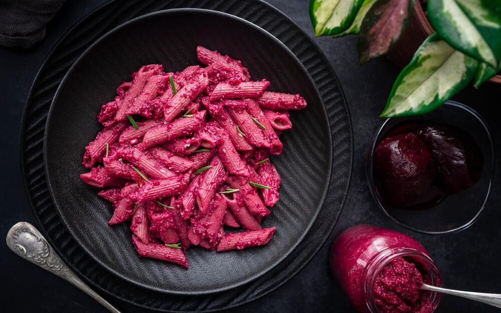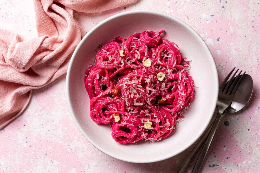 Im folgenden Pasta-Rezept für vier Personen verleiht Rote Bete dem Gericht eine tolle Farbe. Im ersten Schritt heizen Sie den Backofen auf 200 Grad Umluft vor. Danach waschen und vierteln Sie drei Rote-Bete-Knollen und marinieren das Gemüse in Alufolie mit einem Esslöffel Olivenöl sowie Salz und Pfeffer.