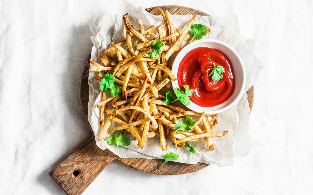 Für Pommes können Sie auch gesunde Pastinaken nutzen. Denn das Wintergemüse punktet mit reichlich Kalium, Magnesium, Phosphor und B-Vitaminen. Waschen und schneiden Sie die Wurzeln (rund ein Kilogramm) in gleich grosse Spalten. Geben Sie das Gemüse in eine grosse Schüssel und geben Sie drei bis vier Esslöffel neutrales Pflanzenöl mit hohem Rauchpunkt (Bratöl) sowie einen Teelöffel Salz und nach Belieben getrocknete Kräuter hinzu.