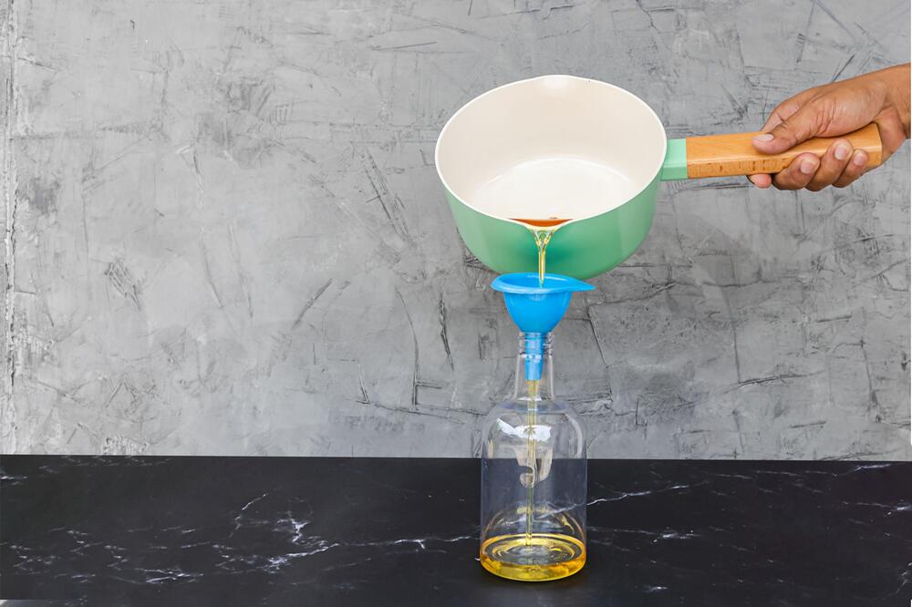 Was ein Abflusssieb nicht abhalten kann: Flüssigkeiten. Öl und Bratfett können aushärten und dann die Abflussrohre und die Kanalisation verstopfen.