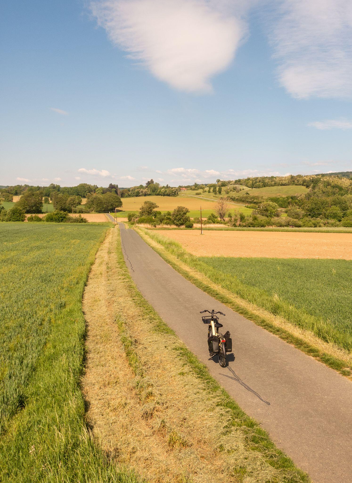 Die "Paradiesroute" durchzieht ein Mosaik aus Feldern, Flüsschen, Hügeln, Wäldern, verstreuten Dörfern, Badeseen. Oft radelt man allein auf weiter Flur. Eine Wohltat, obgleich nicht frei von unparadiesischen Durchhängern: mal ein Gewerbepark, eine sirrende Autobahn. Doch schnell kehrt die friedliche Stimmung zurück.