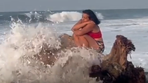 Frau posiert auf Baumstamm am Meer – dann kommt eine Welle
