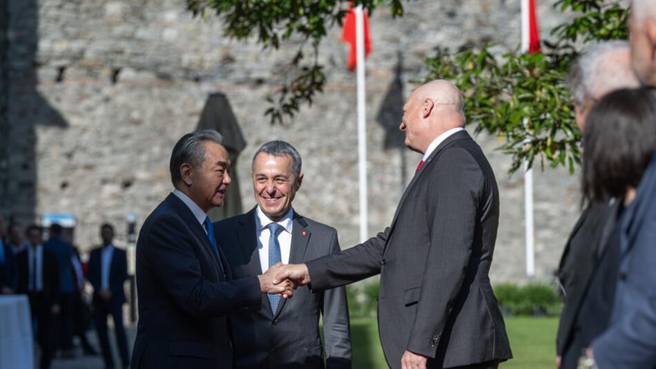 Nach dem Gespräch gaben die beiden Minister im Castelgrande, einer drei Burgen der Tessiner Kantonshauptstadt, eine gemeinsame Erklärung ab. Wangs Besuch in der Schweiz fiel mit dem 75. Jahrestag der Aufnahme diplomatischer Beziehungen zwischen den beiden Ländern zusammen. © Keystone-SDA