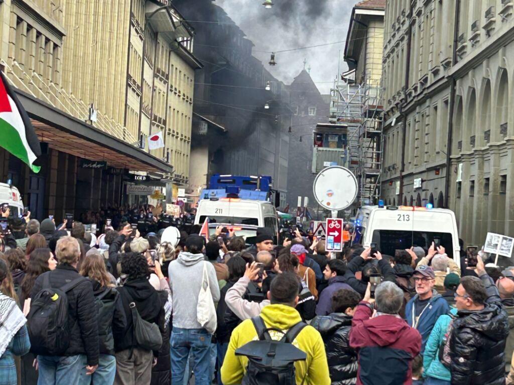 Die Polizei hat Teilnehmende an der unbewilligten Palästina-Kundgebung in Bern am Samstag in der Nähe des Bundeshauses eingekesselt. Dabei kam es zu einem Brand, die Feuerwehr rückte an.