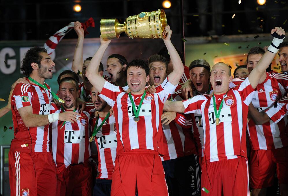 Die Meisterschaft bleibt jedoch nicht Müllers einziger Titel in der Saison 2010: Auch den DFB-Pokal kann Müller (im Bild hinter Mark van Bommel, mi.) gewinnen.