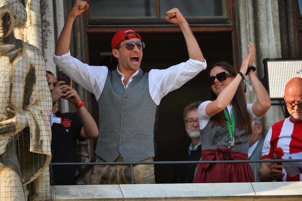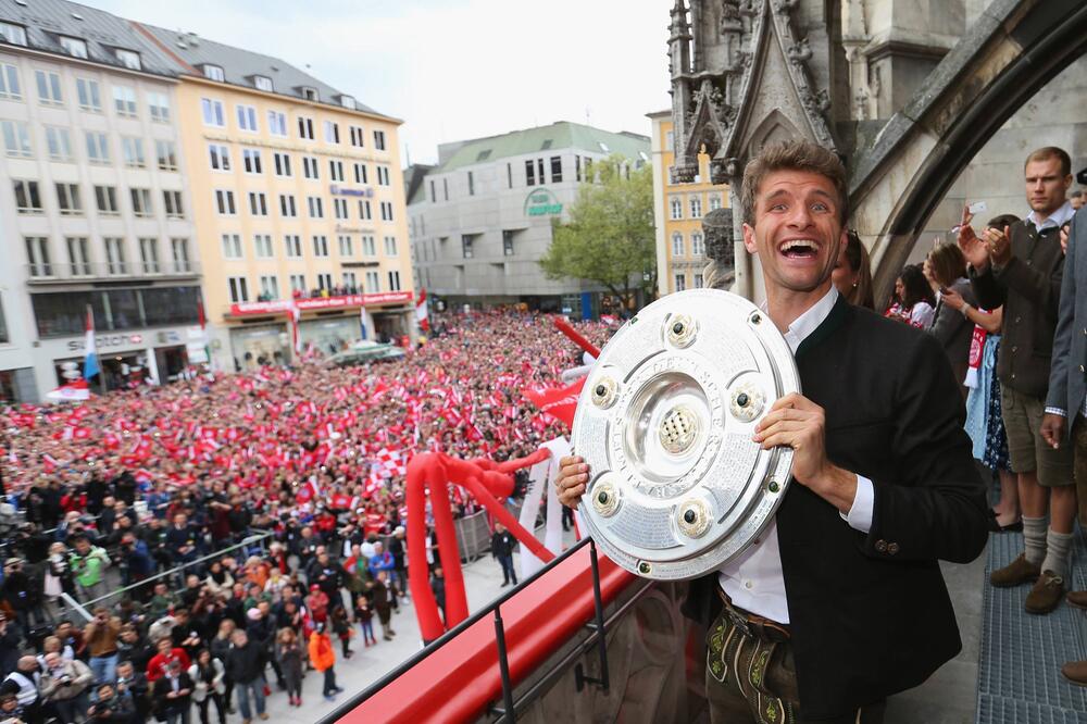 Alle Jahre wieder lässt sich Thomas Müller auch 2016 auf dem Münchner Rathausbalkon für den Gewinn der Deutschen Meisterschaft feiern.