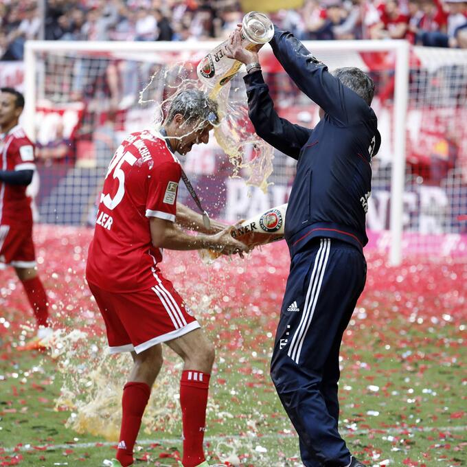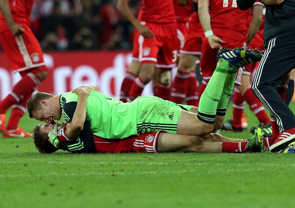 In diesen Wochen kommen die Bayern aus dem Feiern gar nicht mehr raus: Im Champions-League-Finale in London besiegen die Bayern hochemotional den ewigen Konkurrenten aus Dortmund. In der 89. Minute trifft Robben zum entscheidenden 2:1, Müller steht die gesamte Spielzeit auf dem Platz. Nach dem verlorenen "Finale dahoam" 2012 gibt es kein Halten mehr.