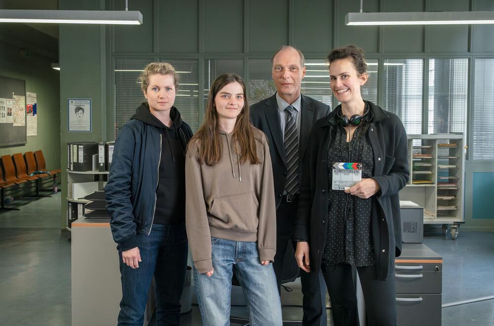 Wie geht es in Dresden weiter? Als nächster Fall kommt der "Tatort: Nachtschatten". Die junge Schauspielerin Emilie Neumeister (2.v.l.) spielt darin eine Episodenhauptrolle. Es geht um eine junge Frau, die behauptet, sie und ihre Schwester wären vom Vater in einem Keller gefangengehalten worden. Auch im Bild: Regisseurin Saralisa Volm (r.).
