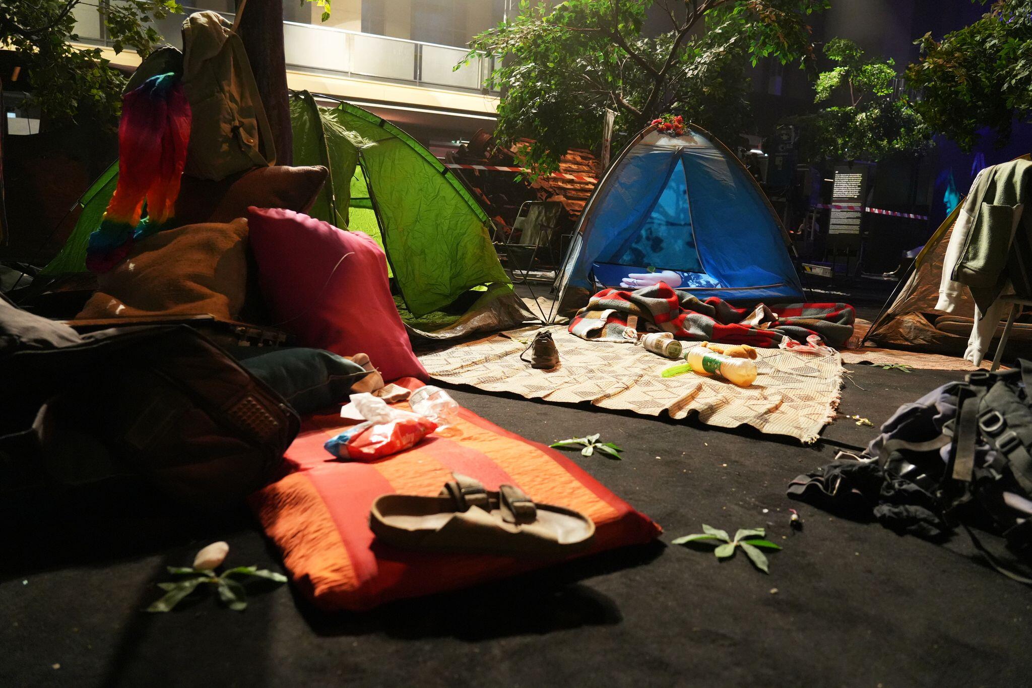 Die Ausstellung im ehemaligen Flughafen Tempelhof ist in drei Teile geteilt, wie Initiatorin und Kuratorin Reut Feingold erklärt. Nachdem man in der Eingangshalle ein Video über die Nova-Gemeinschaft gesehen hat, befindet man sich auf dem nachgebauten Campingplatz mit Zelten, Campingstühlen, ausgebrannten Autos, Toiletten. Alle Exponate seien echte Stücke vom Festivalgelände, erzählt die Kuratorin. Die Besucher seien eingeladen, an allem zu riechen und die Exponate anzufassen oder etwa die Handys, auf denen Videos abgespielt werden, in die Hand zu nehmen.