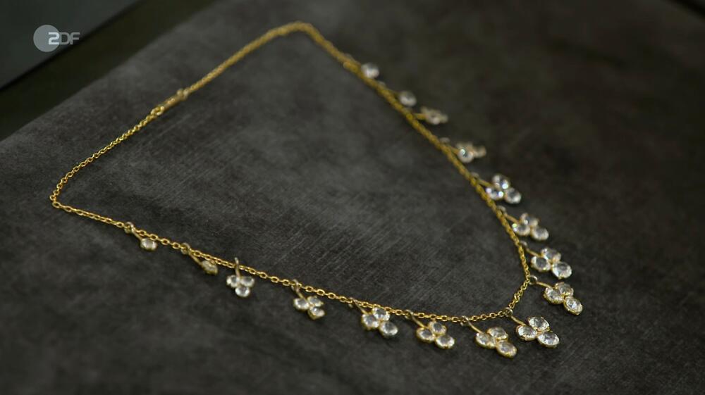 Simone und Frank aus Stolberg wollen eine Kette verkaufen, die nicht mehr getragen wird. Aufgrund des Motivs des dreiblättrigen Kleeblatts verortet Wendela Horz den Schmuck aus dem Jahr 1900 nach Grossbritannien oder Irland. Auch die 375er Legierung spricht dafür.