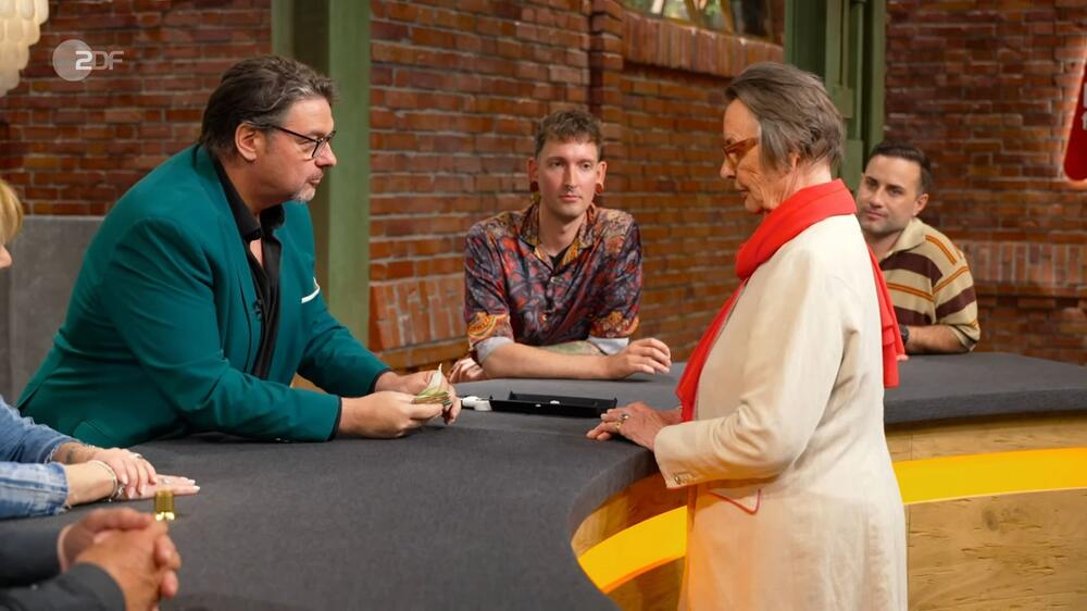 Meyer (r.) will vom Verkäufer wissen: "Wie viele Klemmbrett-Werbeklemmen-Sammler gibt es in Deutschland?" Gerd verrät: "Nicht so viele." Er meint: "Im Netz sind die selten. Und dann auch relativ hochpreisig." Fabian Kahl überzeugt die Info: "Sie machen es uns richtig schmackhaft."