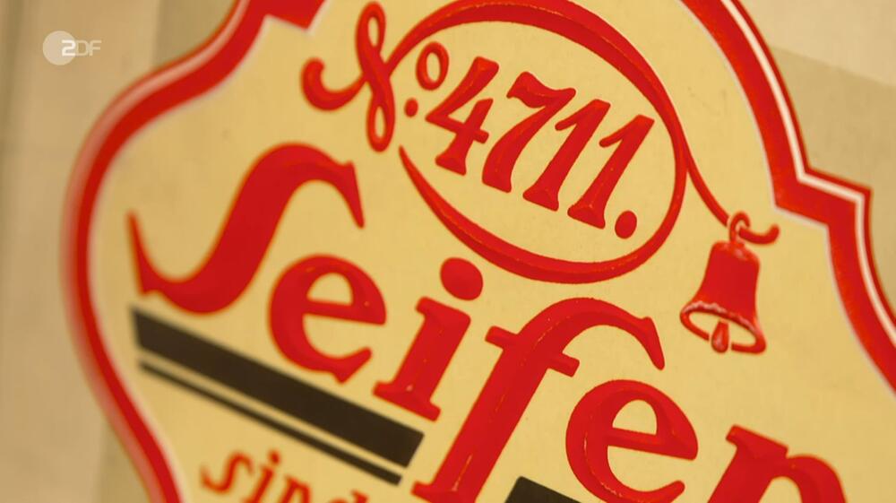 Als es um die Werbung für Seifen der bekannten Kölner Firma 4711 geht, kann sich die Verkäuferin selbst als Expertin beweisen: "Was ich noch weiss, ist, dass wohl der Herr Stollenwerk auch die neue - also das ist ja noch die alte Farbgebung von 4711 - kreiert hat, so, wie sie bis heute ist", erklärt sie den beiden Herren.