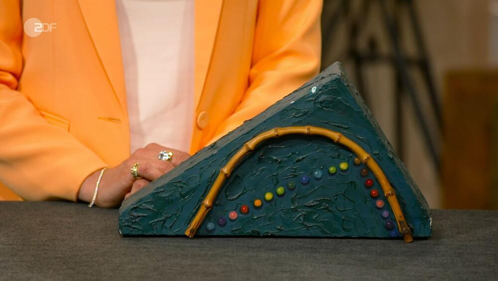 Jennifer und Marc wollen das Kunstwerk "Phythagoras-Thales?" von Wolfgang Niedecken verkaufen. Für das vom Künstler auf den 10.12.1975 datierte und signierte Objekt aus Holz, Leinwand und Bambus hoffen die beiden auf 1.500 Euro. Expertin Berding schätzt den Wert deutlich höher, auf 2.500 bis 3.000 Euro ein.