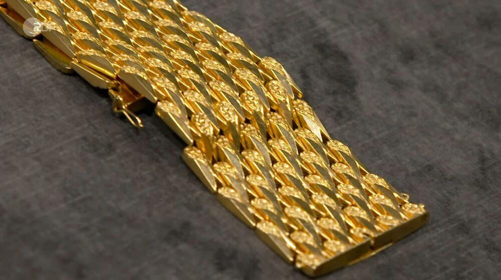 Monique möchte, dass ihr italienisches Armband aus den 60er-Jahren aus 750er-Gold nicht mehr in der Schublade herumliegt. Sie möchte dafür 7.000 bis 7.500 Euro haben, doch Expertin Rezepa-Zabel bremst aus: Trotz des sehr guten Zustandes taxiert sie den Wert niedriger, auf 6.600 bis 7.200 Euro.