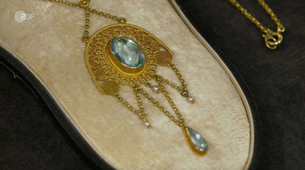 Laut Expertin wurde die Kette mit Anhänger samt Aquamarin und Flussperlen zwischen 1900 und 1910 gefertigt. Der Wunschpreis liegt bei 900 Euro. Die Expertin schätzt den Wert zwar auf 1.200 bis 1.500 Euro, fügt aber hinzu: "Dafür müssen Sie verhandeln!"