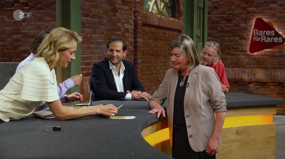 "Aber die Auflagenzahl steht hier nicht drauf", mosert Lehnertz. Die hat sich aber Händlerin Nüdling gemerkt. "2.000", sagt sie - und Pauritsch scherzt: "Das ist aber ein starkes Gebot!" Auch Lehnertz schiebt ihr sogleich das Set zu und meint: "Viel Spass beim Spielen!" Doch Nüdling lacht nur hysterisch.
