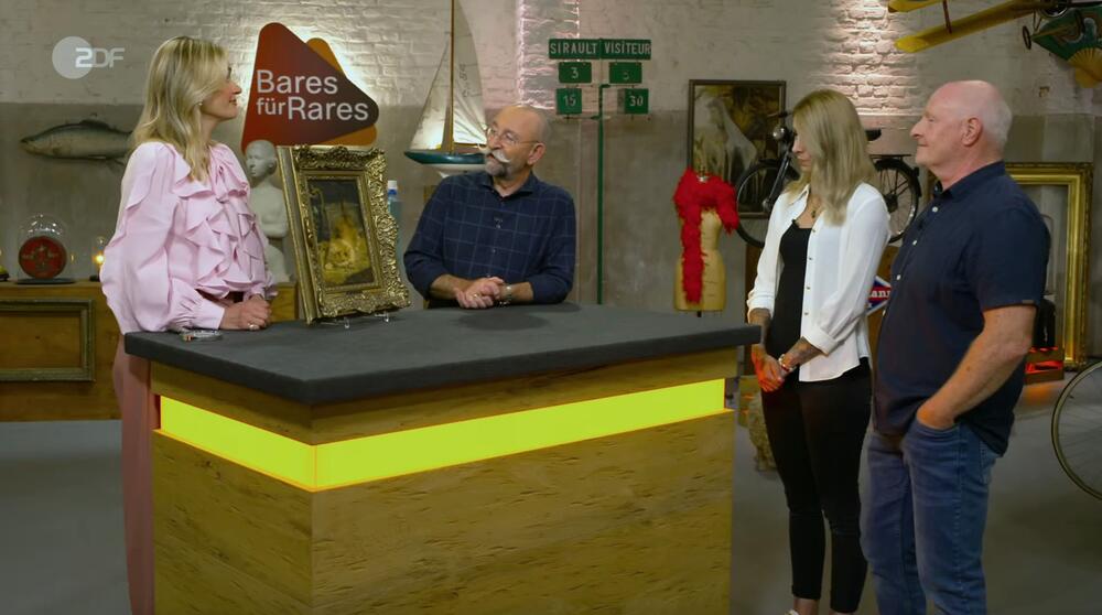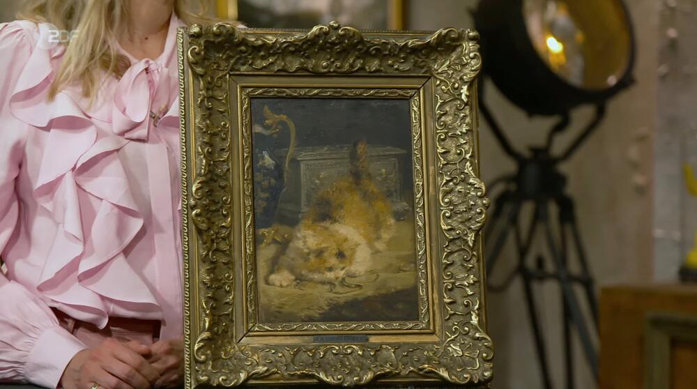 Als weiteres Objekt der Sendung bringen Jenny und Michael aus Lohra ein Bild mit, das "etwas Besonderes sein könnte", meint der Verkäufer. Laut Plakette im Rahmen hat Charles van den Eycken das Werk (Öl auf Holz) Ende des 19. Jahrhunderts gemalt. Laut Bianca Berding (l.) hat sich der belgische Maler auf Katzen und Hunde spezialisiert.