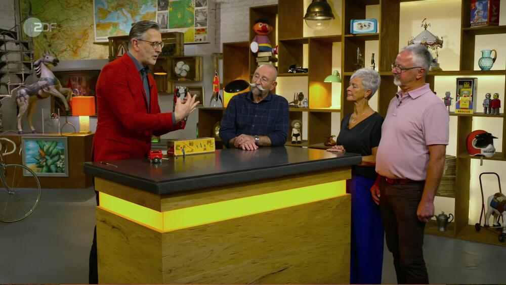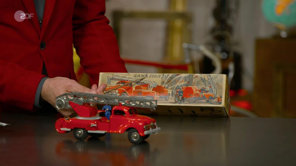 "Sehr hübsch", schwärmt Horst Lichter, als Monika und Paul aus St. Wendel ihr Flohmarkt-Fundstück präsentieren. Detlev Kümmel datiert den Feuerwehrwagen mit Anhänger der Firma Gama auf die 1950er-Jahre. Auch der Originalkarton ist dabei.