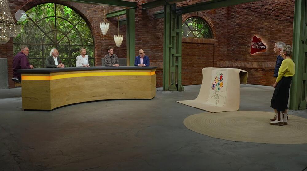 Abgebildet ist ein Motiv nach Pablo Picasso ("Le Bouquet", 1958) und die Stückzahl des limitierten Objekts liegt bei 500. Leider ist ein Riss im Teppich, der mit einem Cuttermesser damals beim Auspacken passiert ist. Dennoch liegt der Wunschpreis bei 500 bis 800 Euro.