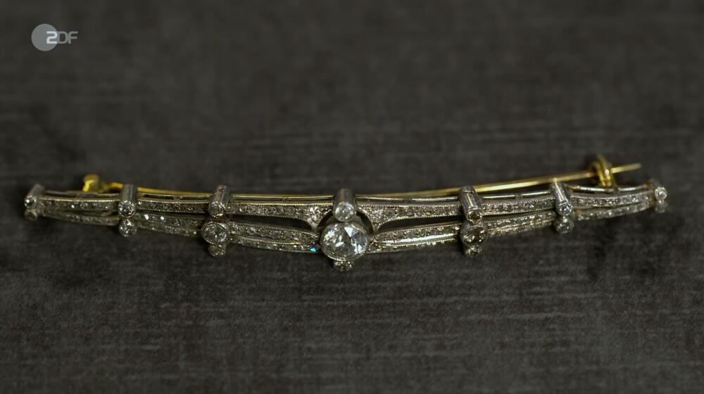 Antje aus Seggebruch will eine Stabbrosche ihrer Grossmutter verkaufen. Patrick Lessmann testet den nicht punzierten Schmuck aus Platin und 585er Gelbgold. Dazu sind Diamanten im Altschliff und Diamantrosen (insgesamt 1,2 Karat) auf der Brosche gesetzt.