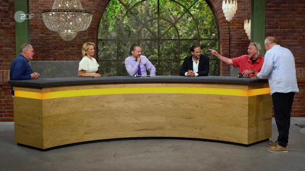 Das "tolle Gefecht", wie Pauritsch es nennt und für die Unterhaltung dankt, geht aber noch weiter. Schliesslich bietet van Katwijk (l.) "Fünfeinhalb" und Sitznachbar Julian Schmitz-Avila macht grosse Augen: "Fünfeinhalb Tausend?" Aber so viel ist ihm der Polizist nun doch nicht wert. Er stellt klar: "550 Euro."